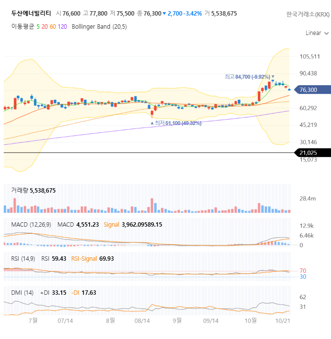 펀더멘탈이 '왜' 사야 하는지에 대한 이유라면, 차트는 '언제' 사야 하는지에 대한 힌트를 줍니다. 현재 두산에너빌리티의 일봉 차트를 속닥속닥 파헤쳐 보겠습니다.