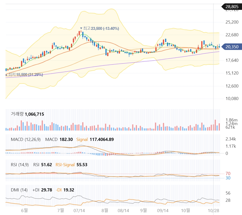 | 현재 주가 (25.10.28) | 20,350원 | 20일선 부근에서 횡보 |