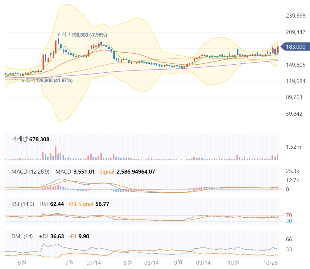 "차트가 '나 이제 간다!'고 강력하게 외치는 모습입니다. 9월 저점 이후 완벽한 우상향 추세를 그리고 있죠. 첫째, MACD 지표가 9월 중순 0선을 돌파한 이후, MACD(3,551)가 Signal선(2,586) 위에 머무르며 강력한 매수 신호를 유지하고 있습니다. 둘째, DMI 지표는 +DI(36.63)가 -DI(9.90)를 압도적으로 상회하며, '이건 찐 상승 추세'임을 확인시켜 줍니다. 셋째, 20일, 60일, 120일 이동평균선이 정배열 초기 국면에 진입했습니다."